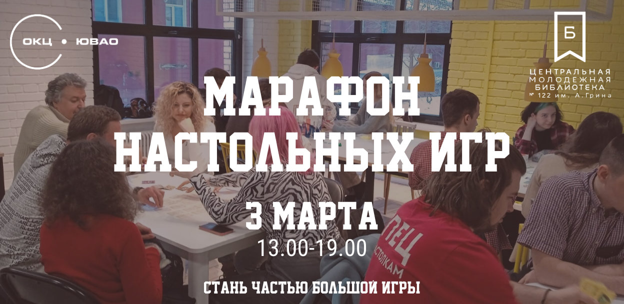 Любителей настолок ждем3 марта с 13.00 до 19.00 (приходить можно в любое время в рамках этого интервала). Опытный ведущий от компании "МОСИГРА" станет надёжным куратором как для новичков, так и для профессиональных игроков настольного жанра))